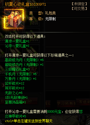 2、沁涼一夏禮盒*1(消耗5000元寶打開禮盒,必定獲得怒炎神甲碎片*5)