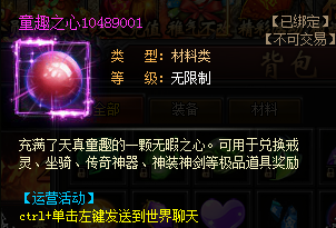 2、童趣之心*1(集齊指定數(shù)量可兌換坐騎、戒靈、傳奇神器及神劍)