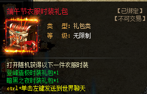 ? 線下活動期間每天單筆充值1000元,即可領取“端午節時裝禮包(衣服,武器二選一)”一個!